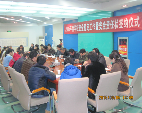 3月5日下午,2015年度学校安全稳定工作暨安全责任状签约仪式会议在行政楼2楼会议室召开,校党委书记沈赤,党委副书记杨俊杰,党委委员、宣传部长周春芬及各尊龙凯时d88尊龙凯时d88职能部门负责人,各学院院长、书记参加会议。