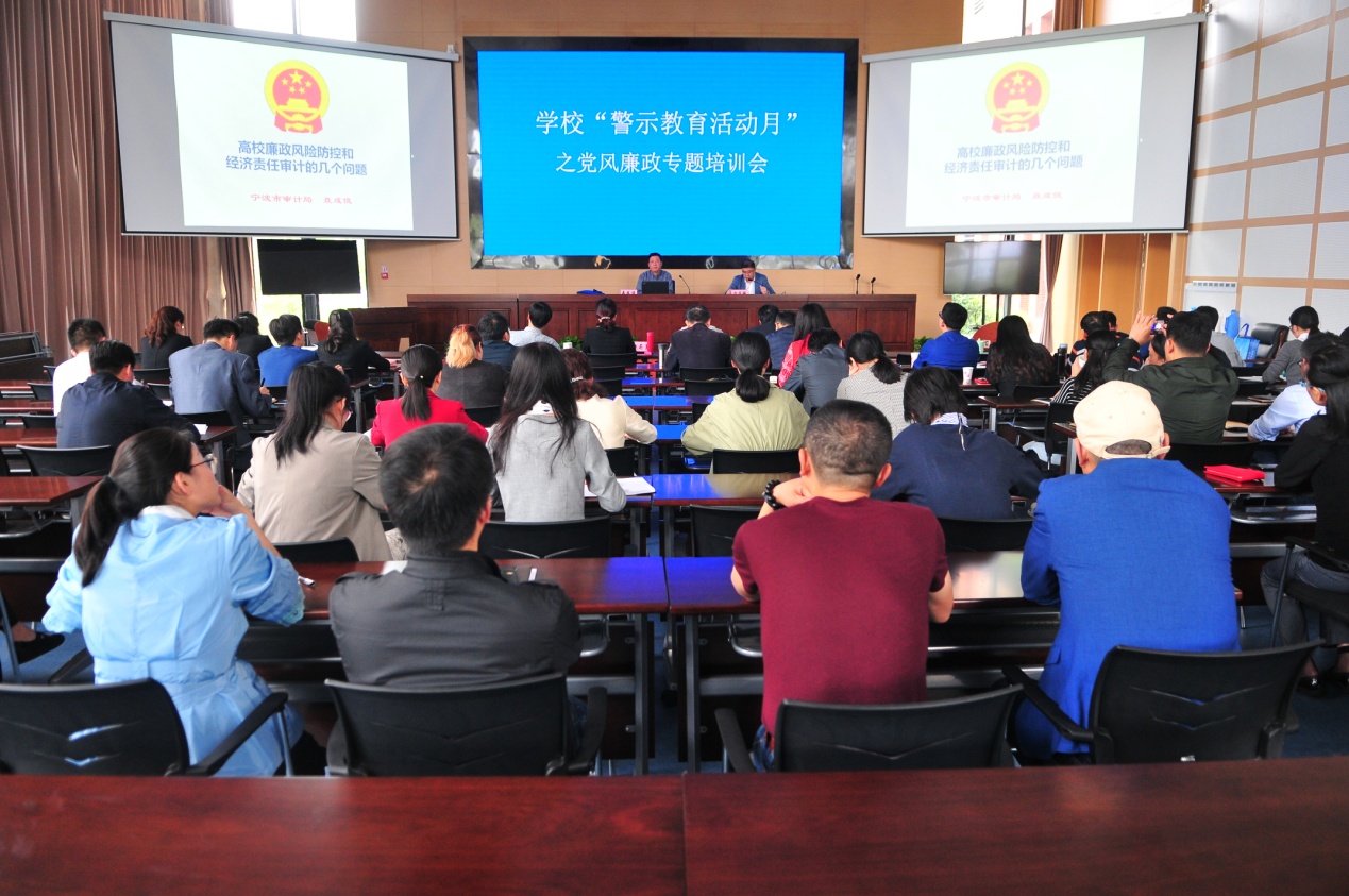 会议邀请了宁波市审计局纪委书记聂咸俊作题为《高校廉政风险防控和经济责任审计的几个问题》的专题讲座。聂书记从形势和特点、案例和警示、代价和损失、法规和法则、自律和他律等五个方面剖析了全国反腐斗争与近几年浙江省高校中出现的违纪违法案件。内容针对性、实用性都很强,对具体在工作履职的同志很有帮助。