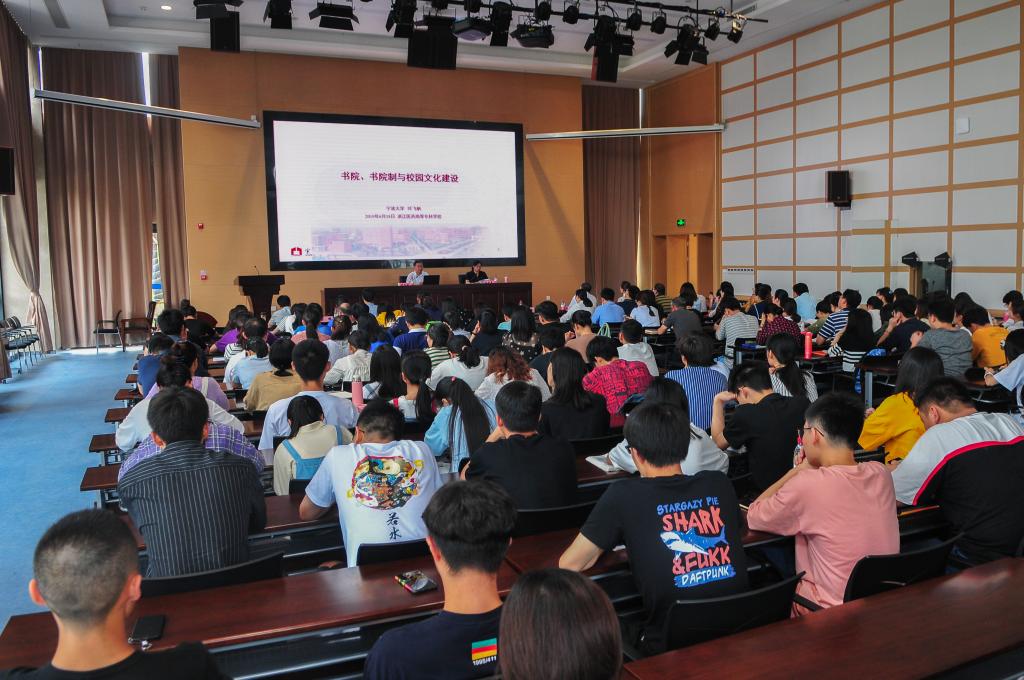 6月18日下午,绍兴文理学院原校长、宁波尊龙凯时d88教授叶飞帆应邀来我校做了题为《书院、书院制与校园文化建设》的专题报告,副校长杨俊杰、校党委副书记许莉勇、副校长韩忠培、纪委书记方子祥、副校长罗文华、党委委员陆晓莉出席报告会。中层干部、党总支委员、党支部书记,全体辅导员、班主任代表和学生干部代表近200人参加报告会。会议由许莉勇主持。