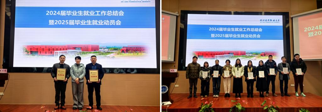 会议首先进行了2024年度就业工作先进表彰,沈黎新为就业工作先进个人王寒寒、周洁、郑勉、石春宇、贝宇倩、周亚妮、孙杰、王重彬、徐翔、谢清清等10人颁发荣誉证书,娄小娥为药学院和药商学院、医药数字化学院2家就业工作先进集体颁发奖牌。随后,先进集体和个人代表就高质量就业典型案例和毕业生就业工作经验认识作交流发言。