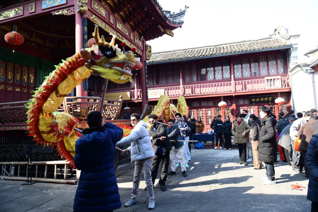 随着宁波城市职业技术学院布龙队的精彩亮相,现场气氛一下子被点燃。古戏台上,金色的布龙腾空而起,在队员的默契配合下,变换出盘、滚、游、翻等多个动作。一曲舞罢,台下掌声连连。在布龙队员的邀请下,留学生们也体验了这项国家级非遗。“这是我第一次尝试布龙,这一项很有挑战性的活动,感觉很有趣。”来自摩洛哥的Kenza说道。